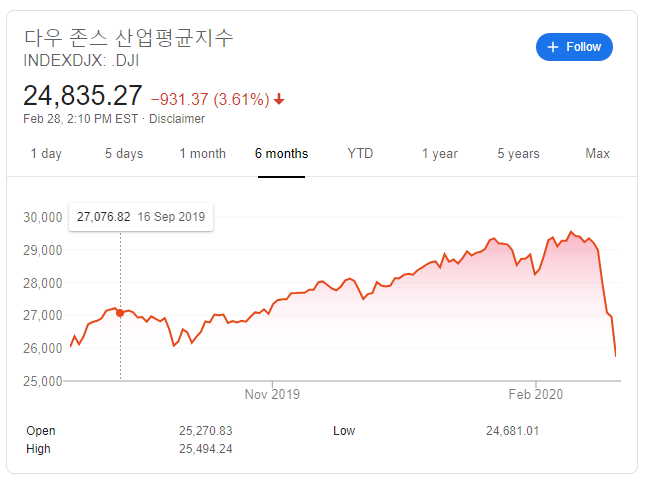 코로나 바이러스로 인한 중국 경제활동 마비가 동아시아 => 유럽 => 미국의 증시에 영향을 주고있다.