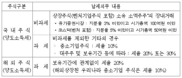 - 해외주식의 경우 지분율 3%미만 시가총액 100억원 미만인 소액주주의 양도차익도 과세 대상이다.