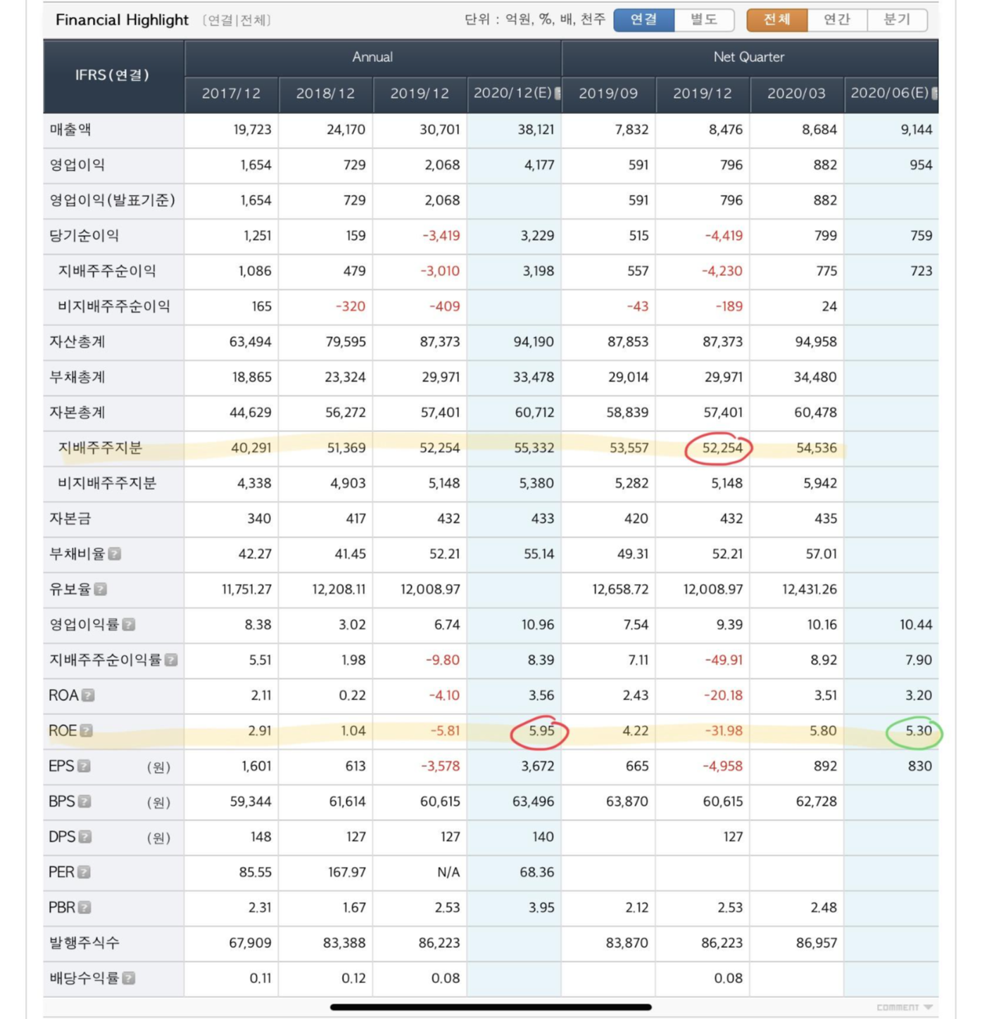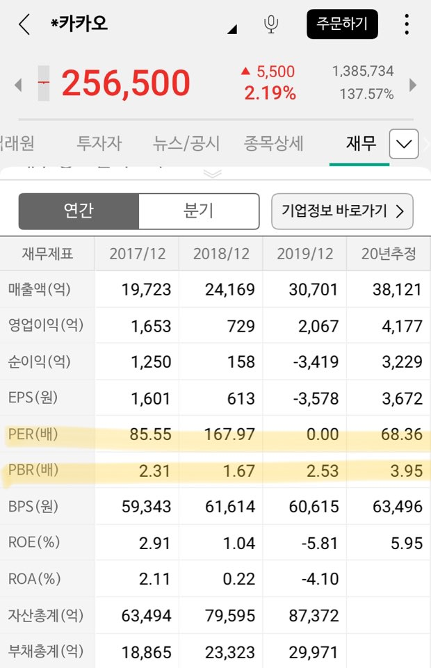 카카오의 PER은 20년추정 68.36으로 PER로만 놓고 보자면 카카오에 투자해 회수하려면 69년이 걸리고, 4배이상이면 버블 국면이라는 PBR은 3.95로 우려스러운 수치입니다. (6월자 자료)