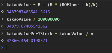카카오 기업가치 = 52254(억) + (52254(억) * (5.3% - 7.94%)) / 7.94% = 약 34,879(억)