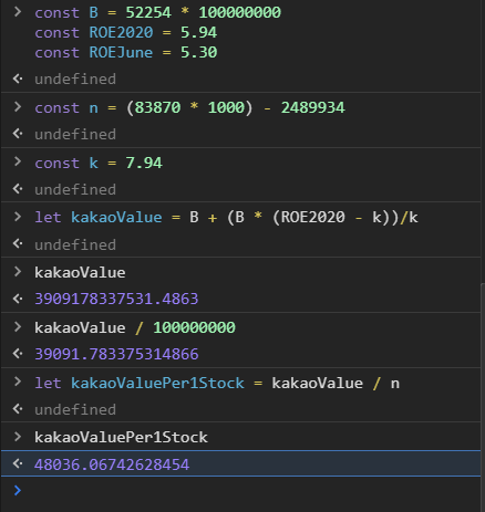 카카오 기업가치 = 52254(억) + (52254(억) * (5.94% - 7.94%)) / 7.94% = 약 39,091(억)