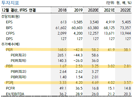 PSR은 초창기 IT 벤처기업와 같이 사용자는 많은데 아직 확실히 이익을 내고 있지 않거나 장부상의 가치도 크지 않는 등 성장주의 가치를 환산하기 위해 매출액을 기준으로 잡은 것. 앞서 본 PER, PBR보다는 카카오의 가치를 환산해보는데 좀 더 적합한 지표라 생각합니다