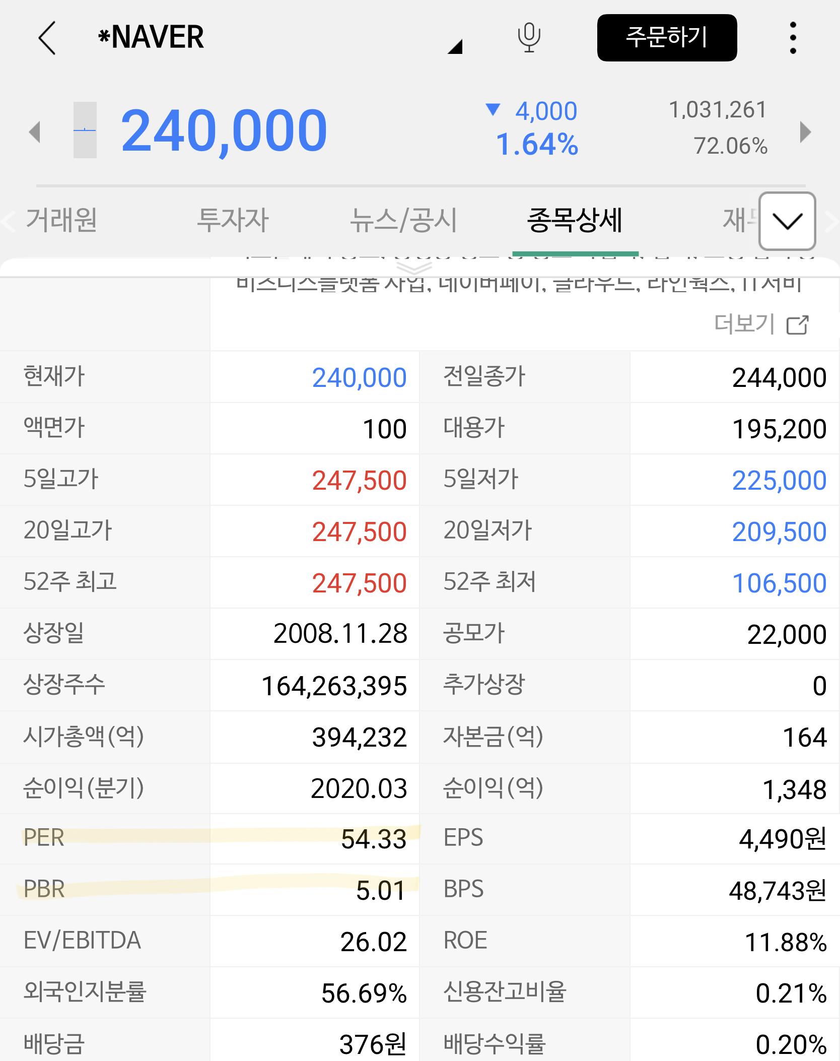 네이버의 PBR은 5.01으로 고평가된 편 입니다.