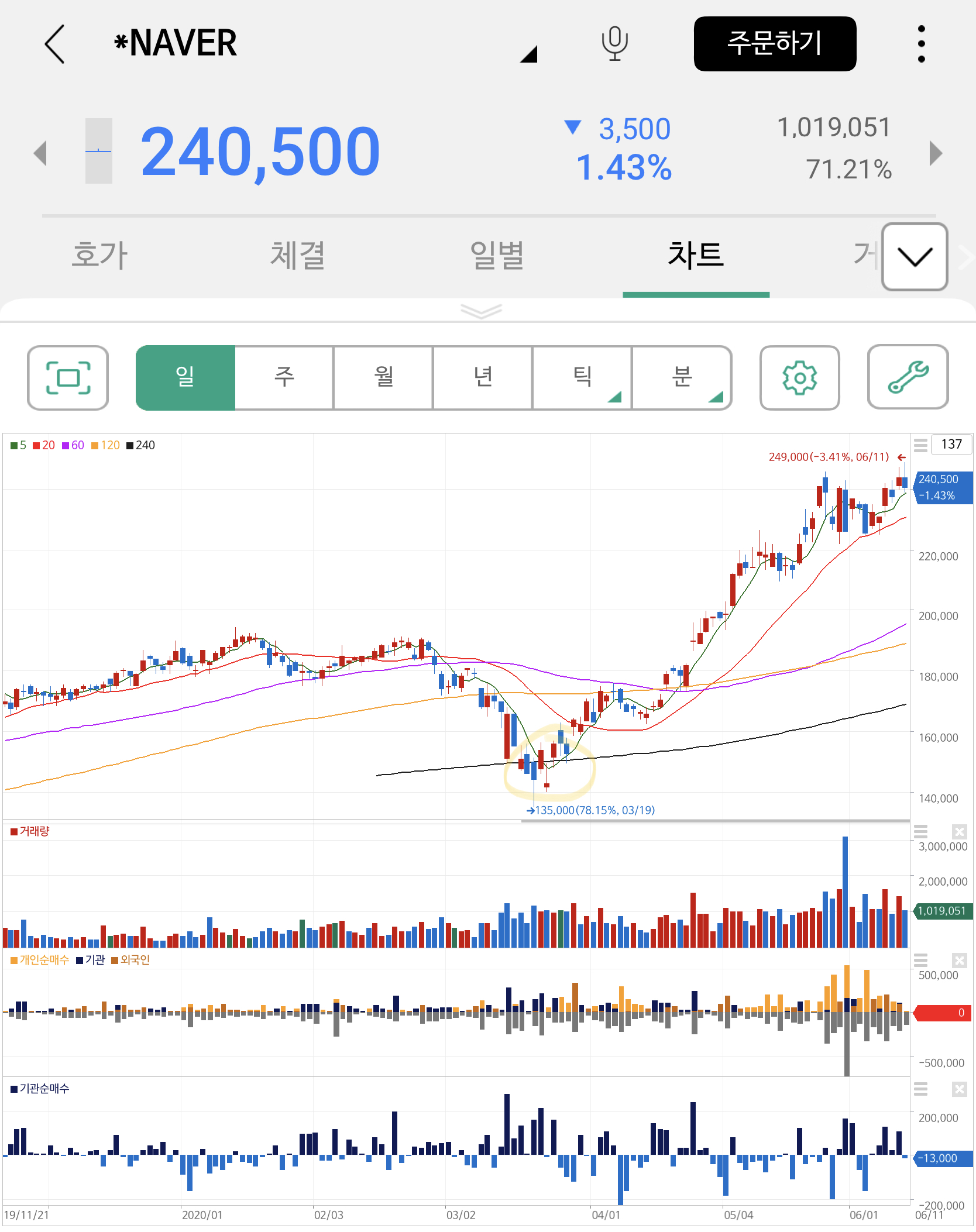 오늘 6월 11일 종가인 240,500(원)과는 큰 차이가 있고,