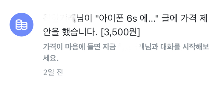 2.제안이 들어오면 위의 사진과 같이 사용자에게 가격제안 알림이 온다.