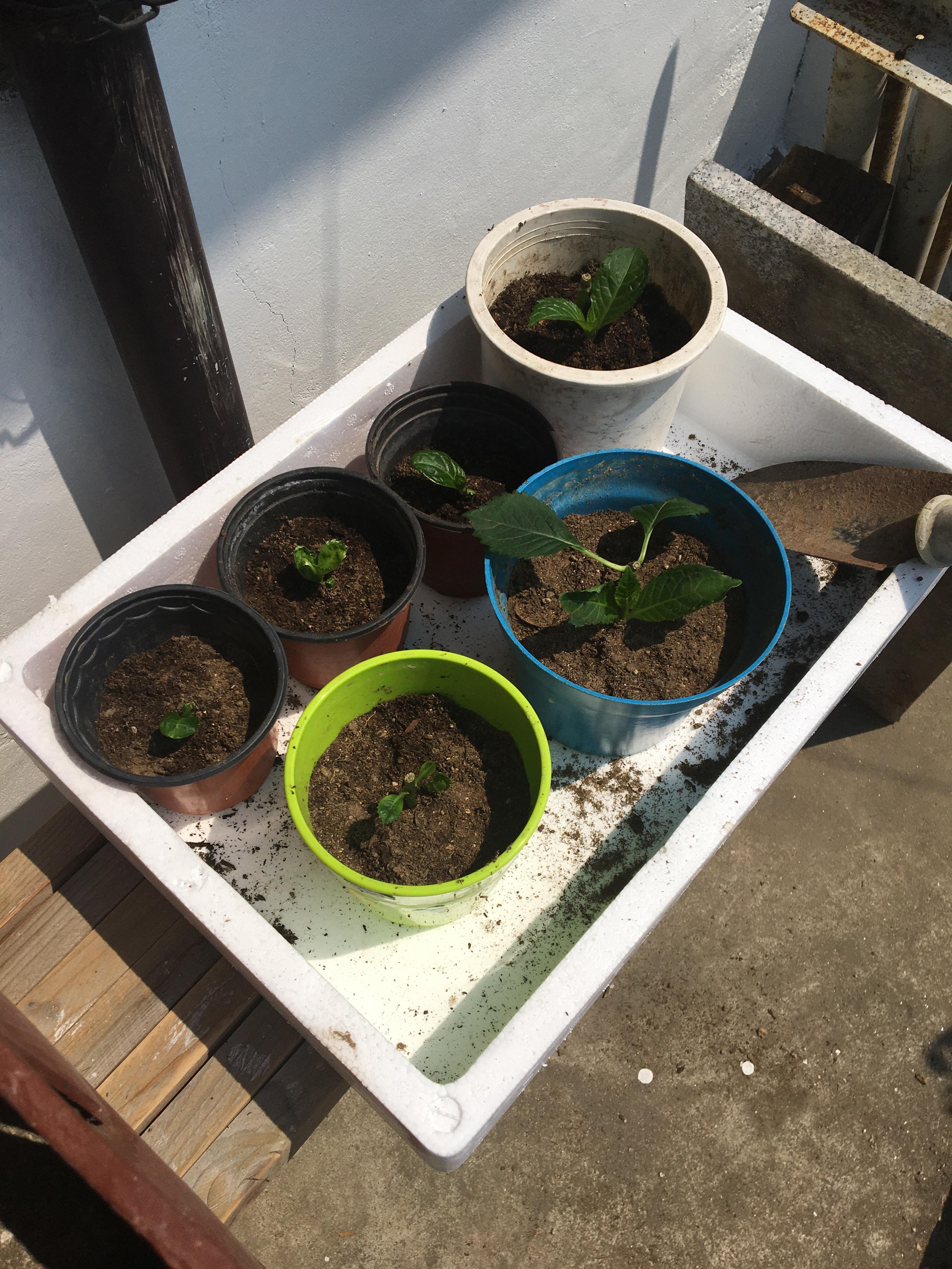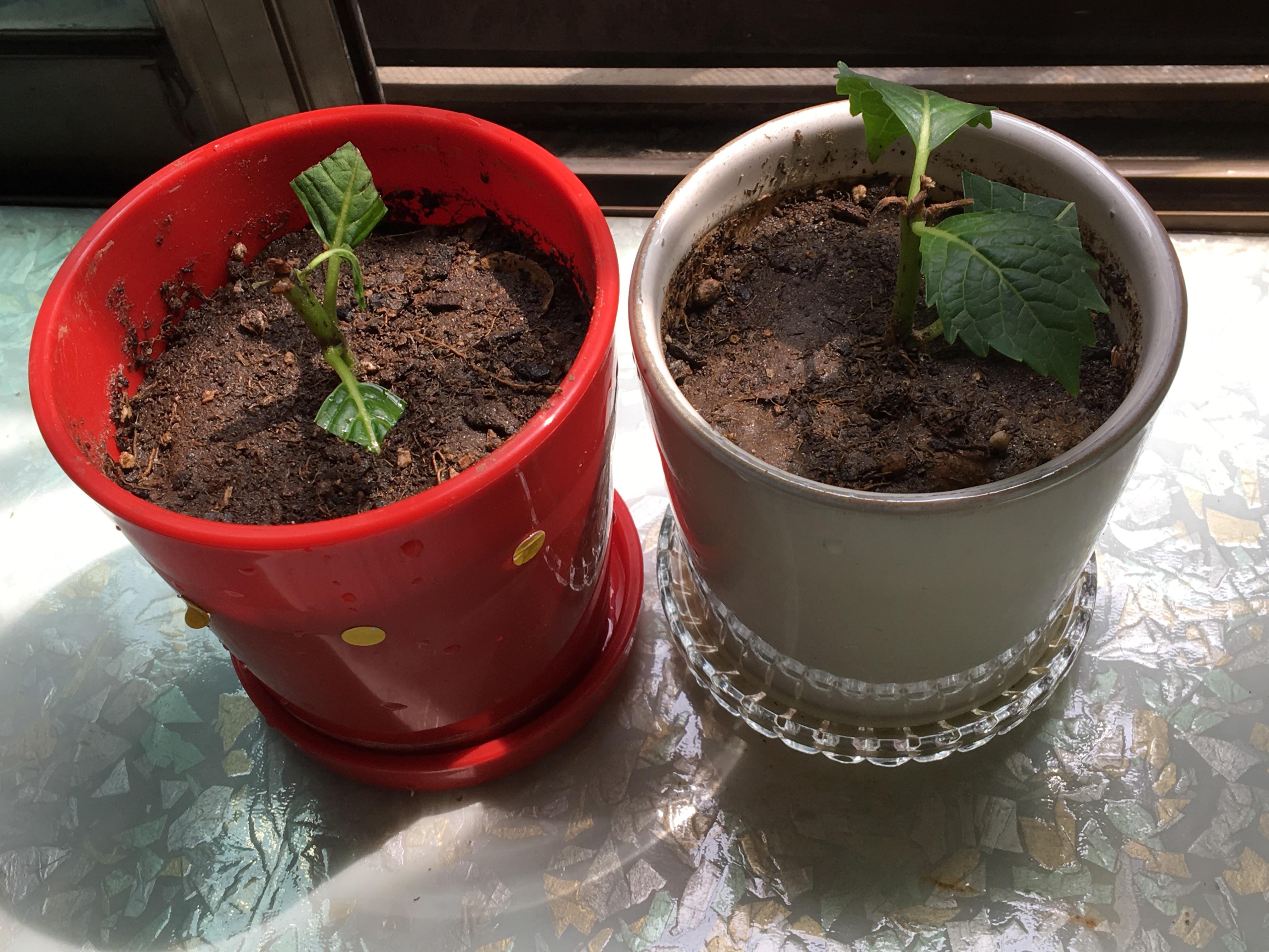 큰 수국 뒤에 보이는 흰 화분에 🌱작은 새싹🌱이 5월초의 아기 수국이고, 기특하게도 한달 반만에 위 사진만큼 자랐습니다.