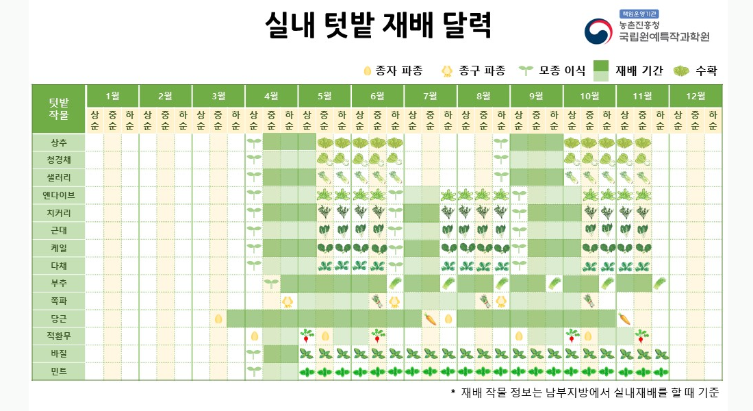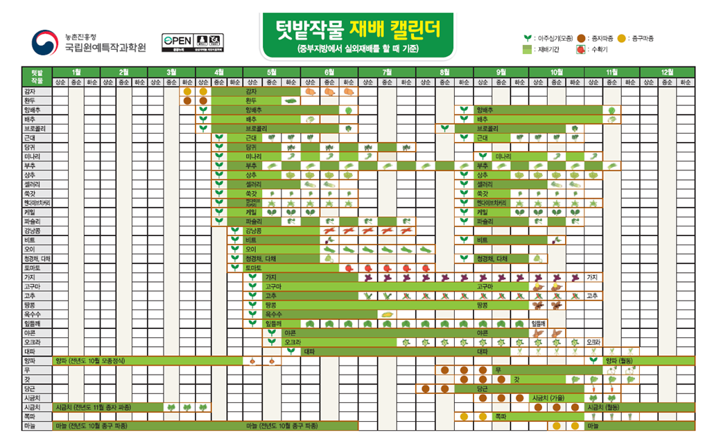 🌱 농촌진흥원에서 중부지방 실외 재배를 기준과 남부지방 실내 재배 기준으로 작물 재배 캘린더를 각각 보기 쉽게 정리해서 올려놓았다. 시기를 놓고 크게 보면 봄에 파종하는 작물들과 가을에 파종하는 작물들로 나뉘어있다.