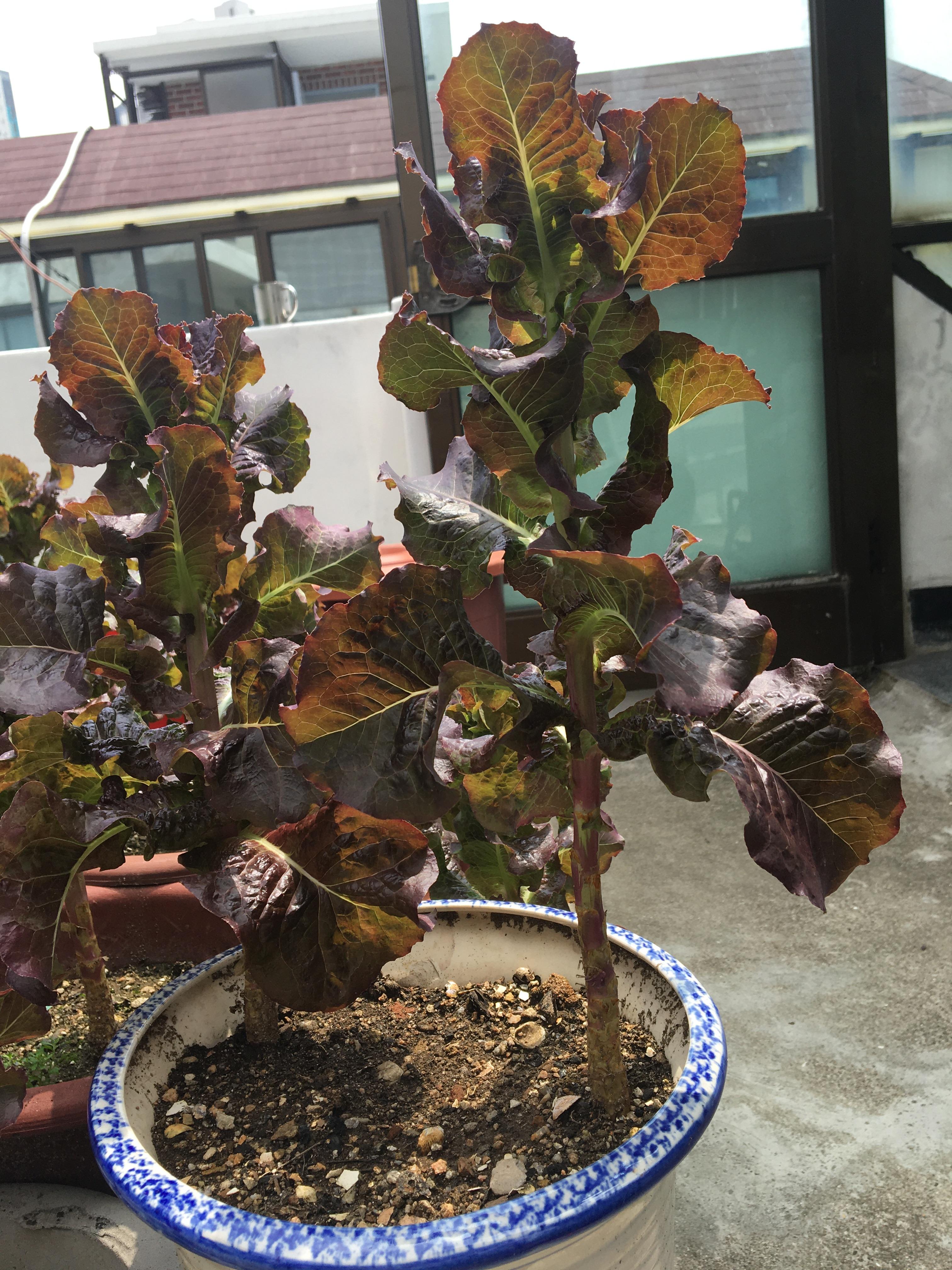 비교를 위해 꽃대가 아직 올라오지 않은 상추 사진을 보면 줄기가 보이긴하지만, 상추를 뜯은 자국이 다닥다닥 나 있는 것이 보입니다. 꽃대가 올라오느라 줄기가 난 것이 아니라 아래쪽 잎들을 계속 뜯어내다보니 줄기가 노출된 것 입니다.