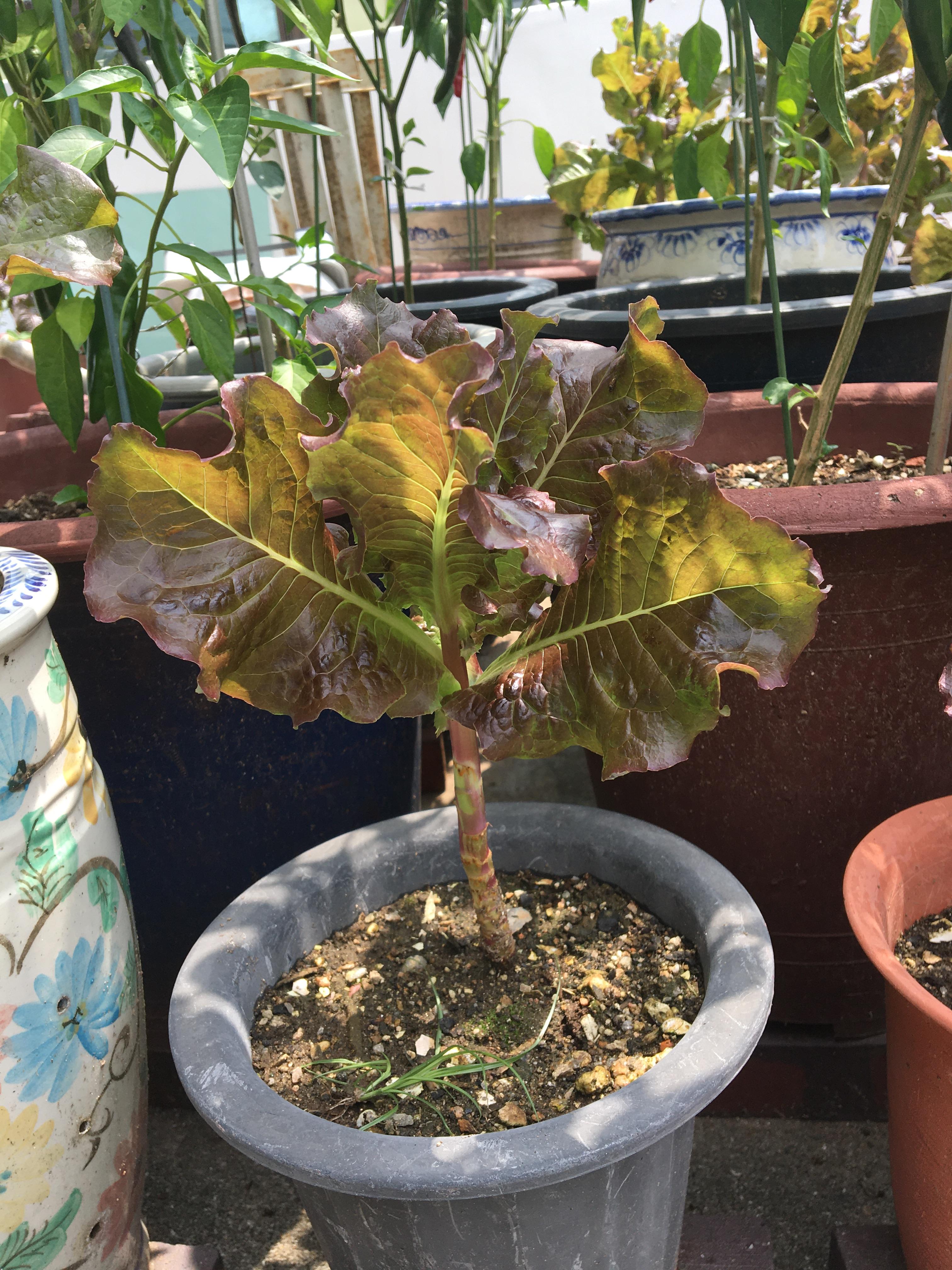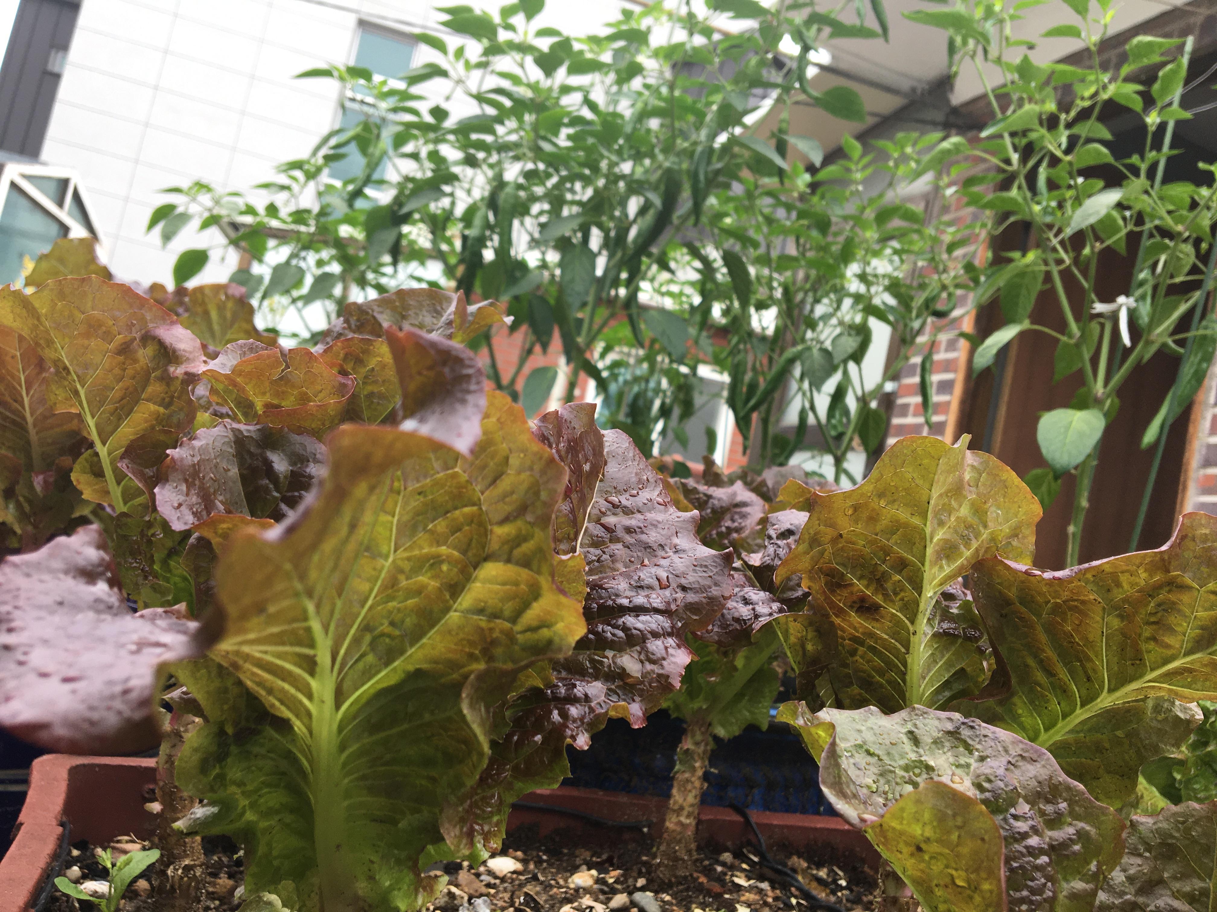 조금 체구가 작은 상추의 경우 아직 헷갈릴 수도 있는데 줄기를 잘 보시면 따먹은 흔적이 남은게 아니라 붉은 색으로 튼튼한 줄기가 쭈욱 자라나고 있다는 것을 확인 할 수 있습니다.