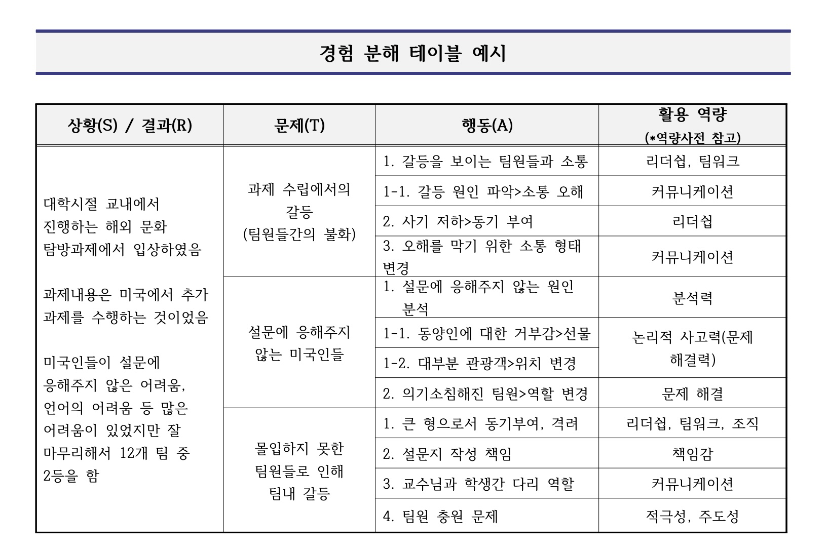 경험 분해 테이블의 예시와 양식, 또 역량사전을 정리했습니다.