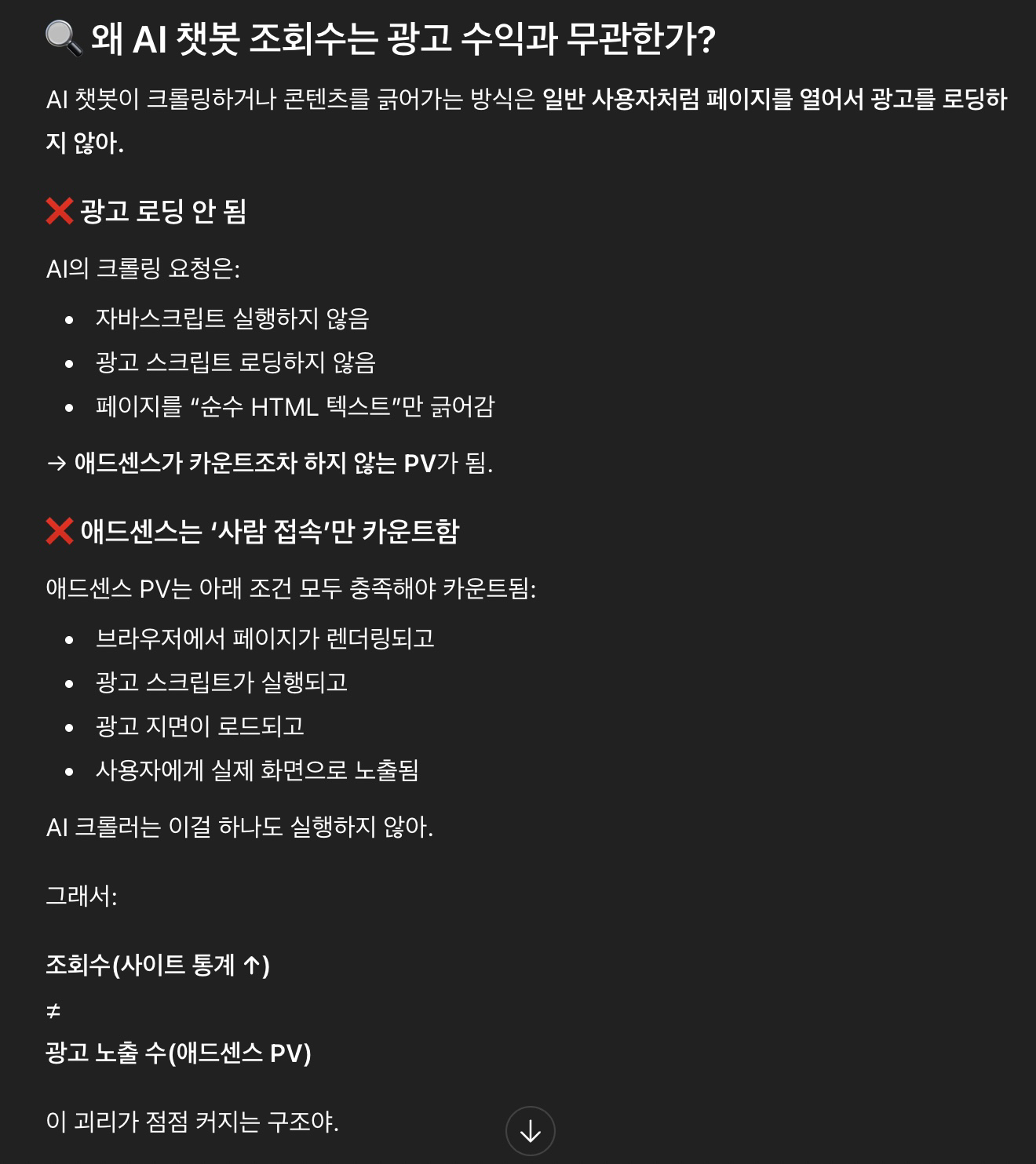 "조회수는 나오는데, 챗봇 트래픽이라 광고 수입이 0원이다"는 가설은