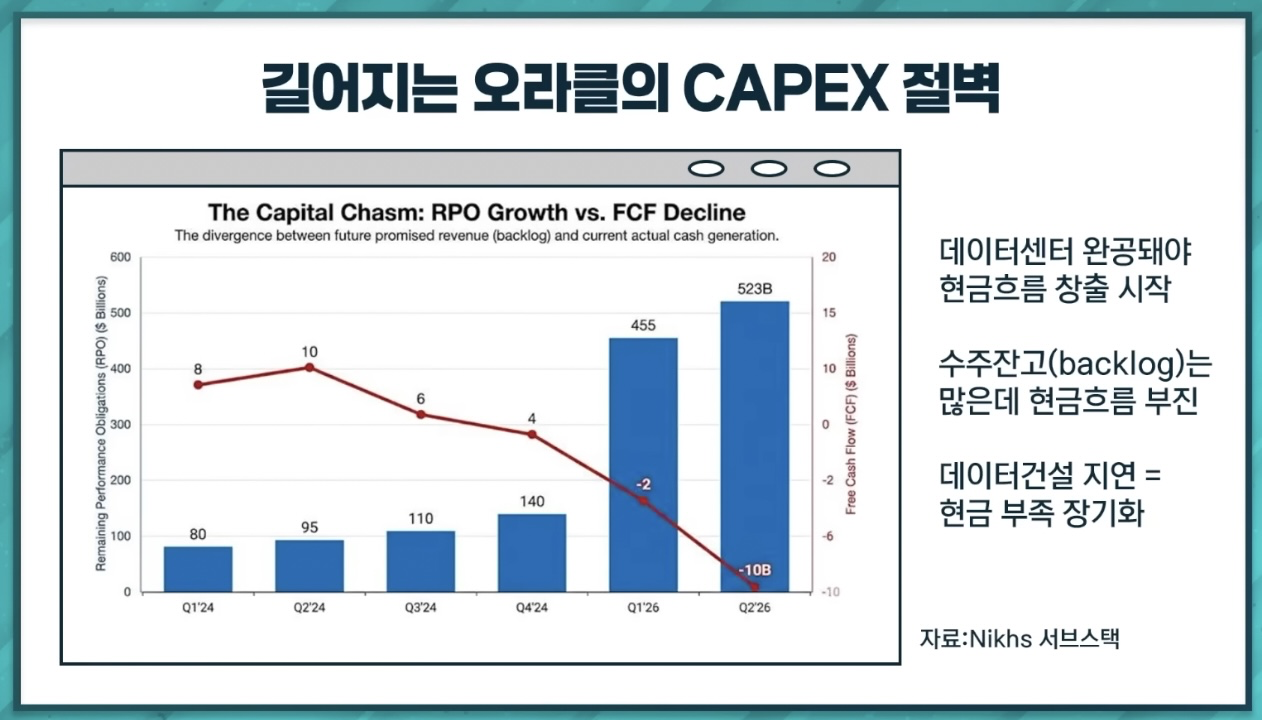 빚내서 AI 데이터센터 짓는데 (CapEx 급증), OpenAI 한 곳에 의존하며, 수주받은 데이터센터는 완공이 늦어질 것 같다.